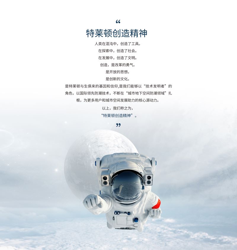 特莱顿(中国)成立以来,坚持以“世界技术中国用”为服务理念,将欧洲高尖排潮技术带入中国市场,成为中国首个服务高端私宅建筑地下空间防潮领域的企业。不仅如此,35年间,特莱顿更是实现了四代防潮技术的更迭,在技术与服务的双轨道,实现“更优质的品牌服务”。